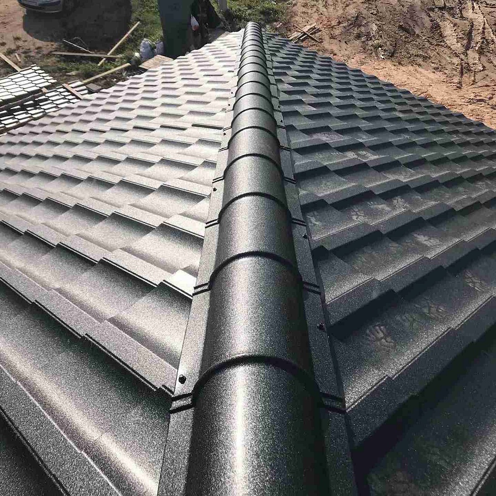 • Монтаж коньковых элементов крыши. На линии стыка скатов закрепляются коньковые планки. Укладываются детали внахлест так, чтобы следующий элемент перекрывал место закрепления предыдущего. Фиксируется коньковая черепица в четырех точках – по две на каждую из сторон.