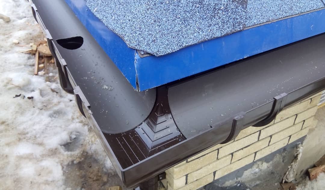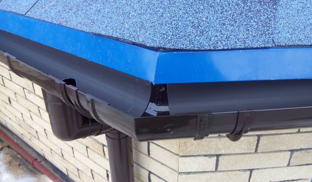 При монтаже водоотвода используется силикон. Путем обработки силиконом уплотнителей системе придается дополнительная прочность. В точке стока над отверстием для слива, в желобе, проделывается отверстие, торцы желоба укомплектовываются специальными заглушками.