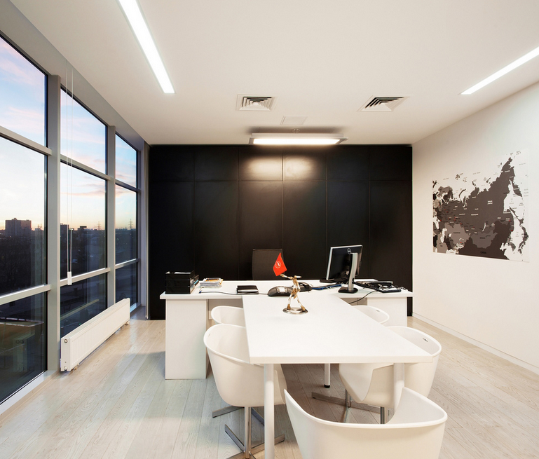 Окна из качественных материалов во всю стену словно открывают для руководителя новые перспективы, наполняют рабочее помещение светом и энергией. В отделке офиса использован строго выверенный минимализм и контраст цвета – это несомненная находка наших дизайнеров.